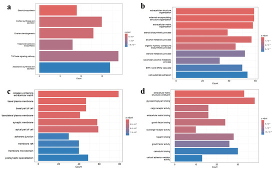 (a) KEGG analysis of the DEGs. (b) The GO analysis of DEGs (biological processes). (c) The GO analysis of DEGs (cellular components). (d) The GO analysis of DEGs (molecular functions).