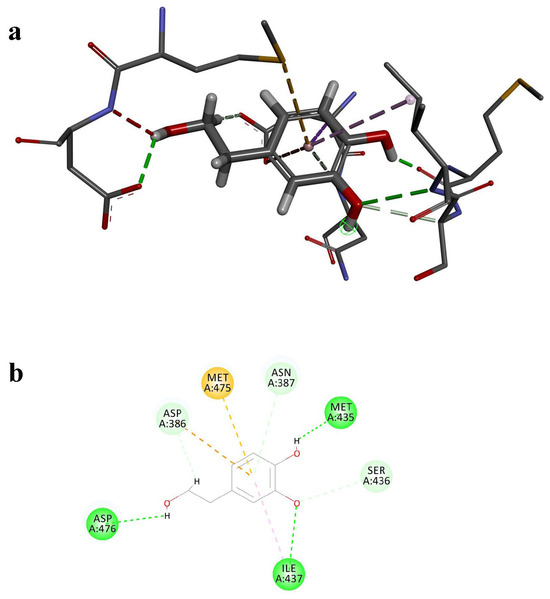 Among the SARs related to the hub genes, ATG7 and BCL2 were identified as containing only FIR motifs, suggesting that non-canonical selective autophagy (FIP200 dependent) may play a role in this regulatory process. To explore potential interactions between ATG7 and the small-molecule plant compound HT, we performed molecular docking. The SMILES and 3D SDF structures of HT were obtained from PubChem, while the most probable protein structure of ATG7 was retrieved from the AlphaFold AI prediction database. Molecular docking was conducted using Discovery Studio 2019 to calculate the LibDock score and visualize the ball-and-stick model and binding site (Figure 4a,b). Additionally, AutoDock Vina was employed to calculate the binding energy. The docking results revealed that the LibDock score between ATG7 and HT was 77.92, with a binding energy of −5.785 kcal/mol. Four conventional hydrogen bonds were formed, indicating that the interaction between HT and ATG7 is meaningful and may involve significant biological processes.