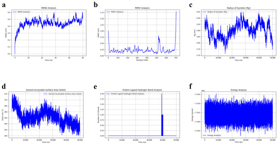 (a) RMSD analysis’s result of molecular dynamics simulation. (b) RMSF analysis’s result of molecular dynamics simulation. (c) Radius of gyration’s result of molecular dynamics simulation. (d) Solvent accessible surface area’s result of molecular dynamics simulation. (e) Hydrogen bond count’s result of molecular dynamics simulation. (f) Total energy analysis’s result of molecular dynamics simulation.