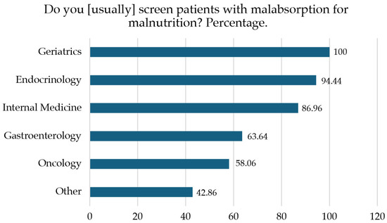 There was a unanimous consensus that screening for malnutrition should be routinely performed in patients with malabsorption. However, only 79% of participants reported that they usually did so, with significant differences between specialties, reflecting a gap between ideal practice and clinical reality. Notably, there is a general lack of specific protocols for the nutritional management of patients, particularly for quantifying symptoms and providing nutritional treatment in conditions with malabsorption. This could be one of the reasons for the observed percentage. This issue explains the consensus among all specialties on the need to create a protocol or algorithm for classification and nutritional treatment that also addresses the role of associated symptoms to guide medical care. The difference in the performance of screening among specialties may be due to various structural and organizational circumstances of hospital departments or the training of professionals in those departments. These aspects are difficult to assess with our current study design. Our Nutrition Unit functions as a transversal care unit for the care of admitted patients, carrying out nutritional assessment, adequate nutritional support, and the transition to hospital discharge with subsequent care continuity. However, it is important to note that hospital organization models can vary widely across Spain. In other institutions, Nutrition Units may be integrated within specific departments, may not function transversally, or may have limited roles in patient follow-up after discharge. These differences in structure and clinical pathways may also contribute to variability in screening performance and nutritional management outcomes.