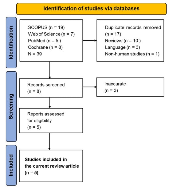 A higher total score indicates a better methodological quality, with a maximum of 5 points. Scores ≥3 are generally considered indicative of high-quality trials. Evaluations using both tools are summarized in Supplementary Materials. The literature search process is illustrated in Figure 1.