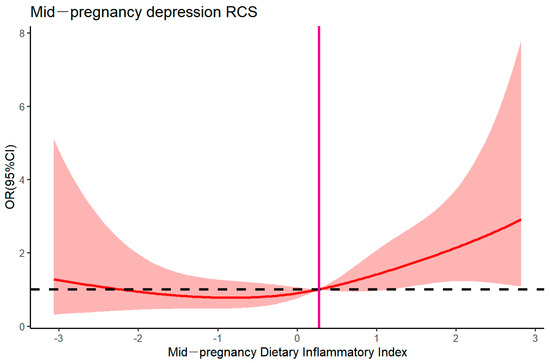 The mid-pregnancy Dietary Inflammatory Index was used as the horizontal coordinate, and the relative risk of mid-pregnancy depression was used as the vertical coordinate. Age, ethnicity, mid-pregnancy BMI, occupation, literacy level, average monthly income, presence of passive smoking, presence of post-pregnancy alcohol consumption, presence of sexual intercourse, sleep quality (PSQI score division), and presence of moderate physical activity were used as covariates and adjusted in a restricted cubic spline plot. The results showed that overall p = 0.045 and nonlinear p = 0.271 > 0.05, suggesting that the mid-pregnancy Dietary Inflammatory Index did not have a nonlinear relationship with the risk of mid-pregnancy depression. Based on the results in Figure 1, when DII < 0.277, the risk of mid-pregnancy depression changes slowly with the increase in DII; at DII = 0.277, the cut-off value of the OR ≈ 1; and at DII > 0.277, the risk of mid-pregnancy depression increases significantly with the increase in DII. Therefore, it is appropriate to control the mid-pregnancy DII to be below 0.277.