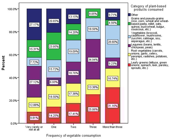 The results indicate a significant association between the frequency of vegetable consumption and the diversity of plant-based products in respondents’ diets (Figure 1). This suggests that individuals who consume vegetables more frequently tend to have a more varied and nutritionally balanced diet, incorporating a wider range of plant-based food categories. This finding is consistent with previous research indicating that higher vegetable intake is associated with improved diet quality and better health outcomes, particularly in adolescents []. Respondents who reported very rare or no vegetable consumption predominantly relied on grains and pseudo-grains, which constituted 27.71% of their intake, while their consumption of vegetables and leafy greens remained minimal at 7.72% and 9.81%, respectively. This dietary pattern suggests a preference for processed or grain-based foods, which may contribute to less balanced nutritional profiles. In contrast, participants consuming one or two categories of vegetables exhibited a more diverse plant-based intake, with higher proportions of root vegetables and general vegetables, indicating a transitional stage towards healthier eating patterns []. A notable dietary shift occurs among respondents consuming three or more vegetable categories. In these groups, vegetable intake significantly increases, with vegetables comprising 18.56% for those consuming three categories and 28.60% for those consuming more than three.
