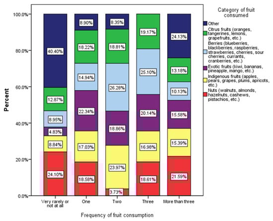 The analysis of fruit consumption patterns among respondents reveals significant in-sights into dietary diversity and health-related behaviors (Figure 2). Individuals who reported consuming fruits very rarely or not at all (24.10%) predominantly relied on items categorized as “other” (40.40%). Their intake of indigenous fruits (8.84%) and citrus fruits (8.65%) was notably lower compared to those with higher fruit consumption. This pattern suggests a limited variety of fruits and possibly a higher reliance on processed or non-fresh fruit options, which may negatively impact their overall nutritional intake []. In the moderate fruit consumption category, participants consuming one (18.56%) or two (23.97%) types of fruits demonstrated an increased intake of diverse fruit categories. For instance, those consuming two types of fruits had higher proportions of berries (26.28%) and citrus fruits (18.86%). This indicates a transition towards more balanced fruit consumption patterns, which is essential for achieving recommended dietary guidelines. A substantial shift is evident in respondents who consume three (18.61%) or more than three (19.51%) types of fruits. These groups showed a marked increase in the consumption of indigenous fruits (16.98% for three types; 15.58% for more than three) and nuts (18.61% for three types; 15.59% for more than three). Conversely, the proportion of “other” fruits declined to 19.17% and 24.13%, indicating a stronger focus on nutrient-rich, commonly consumed fruits. This shift aligns with findings that suggest higher fruit and nut consumption is associated with improved overall diet quality and better health outcomes, including reduced risk of chronic diseases and enhanced immune function [,]. The data reveal that increased frequency of fruit consumption is associated with greater dietary diversity and a shift towards nutrient-rich fruit categories, such as berries, nuts, and indigenous fruits. This aligns with the existing literature indicating that higher fruit consumption contributes to better overall diet quality and improved health outcomes, including reduced risk of chronic diseases and enhanced immune function [,]. The promotion of indigenous fruits and nuts is particularly noteworthy, as these foods are often rich in essential nutrients and can play a significant role in addressing dietary deficiencies in various populations [,]. Furthermore, the integration of indigenous foods into diets has been shown to enhance nutritional security and improve health outcomes, particularly in communities that traditionally rely on these foods [].