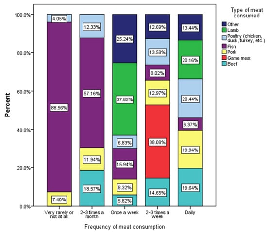 Figure 3 illustrates the distribution of various meat types consumed by respondents in relation to the frequency of their meat consumption. The analyzed meat categories include poultry (such as chicken, duck, and turkey), fish, pork, game meat, beef, lamb, and a miscellaneous category labeled as “other”.