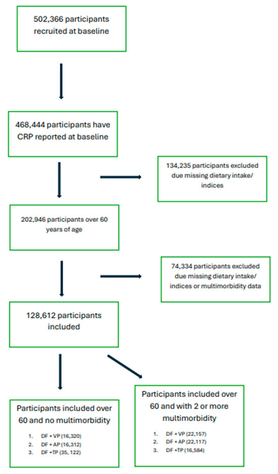 However, this study also has several limitations. The reliance on self-reported dietary intake is subject to reporting bias and both underreporting and overreporting, which could lead to inaccuracies in estimating absolute intakes. However, since the 24 h dietary recalls were repeated on multiple occasions, the bias and reporting inaccuracies may have been reduced. Secondly, the study population consisted of primarily White British adults, which limits the generalizability of the results to the wider population. As a predominantly healthy volunteer cohort, UK Biobank participants may not represent the general older adult population. Lastly, since CRP was only measured at baseline, it may not be a true proxy for ongoing systematic inflammation; however, there is evidence which supports the predictive value of baseline CRP in predicting multimorbidity and related health outcomes. Replication in other large cohorts is warranted. Further research through prospective cohort studies and randomised trials should examine these diet–inflammation links over time and test whether purposefully modifying protein and dietary fibre intakes impacts inflammatory outcomes.