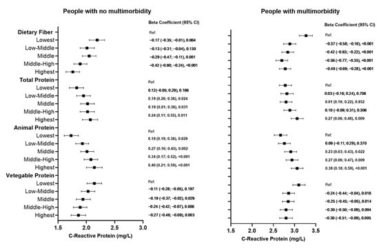 A systematic review of 19 randomised controlled trials demonstrated that higher red meat consumption was associated with elevated CRP levels (0.12 mg/L, 95% CI: 0.04, 0.19). Subgroup analyses revealed that red meat consumption was significantly associated with increased CRP levels in participants with diagnosed diseases (0.20 mg/L, 95% CI: 0.08, 0.32). However, no significant association was observed in participants without diagnosed diseases (−0.04 mg/L (95% CI: −0.17, 0.10) [51]. In a cross-sectional analysis, CRP levels demonstrated significant associations with meat consumption. Each additional 50 g/day of unprocessed red meat intake was associated with a 14.4% increase in CRP (95% CI: 13.6, 15.1%), while total meat consumption showed an 11.6% increase (95% CI: 36.0, 40.7%) [52]. Moreover, in a meta-analysis by Neuenschwander et al., it was observed that replacing red meat with whole grains (0.96; 95% CI: 0.95, 0.98, n = 3) and nuts (0.093; 95% CI: 0.91, 0.95, n = 9) was linked with decreased risk of all-cause mortality [53]. The results of the present study are in line with past findings, indicating that higher consumption of animal protein including red meat could lead to an increase in CRP levels especially in people with multimorbidity.