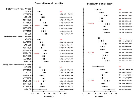 Association of combined tertiles of dietary fibre and protein intake (vegetable, animal, and total) with CRP in older adults with and without multimorbidity. LVP: low vegetable protein, MVP: middle vegetable protein, HVP: high vegetable protein, LAP: low animal protein, MAP: middle animal protein, HAP: high animal protein, LTP: low total protein, MTP: middle total protein, HTP: high total protein, LDF: low dietary fibre, MDF: middle dietary fibre, and HDF: high dietary fibre. For each comparison, the beta coefficient (95% CI) and significance (p value) are stated. * indicates significant interaction (p < 0.05).