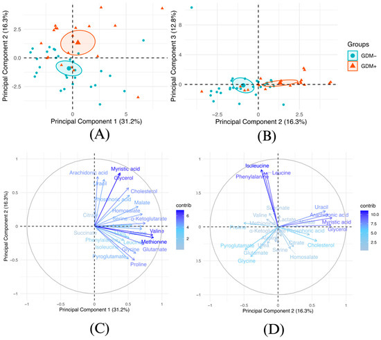 Distinct metabolite profiles in human milk from GDM+ and GDM- mothers. Visualization of the principal component analysis (PCA) modelling the human milk metabolite profile. The loading plot of all human milk metabolites in principal components 1 and 2 (A) or principal components 2 and 3 (B). Ellipses are confidence intervals from the mean center of each group (GDM-: Blue, GDM+: Red). Graph of individuals of principal components 1 and 2 (C) and of principal components 2 and 3 (D) of the PCA model.