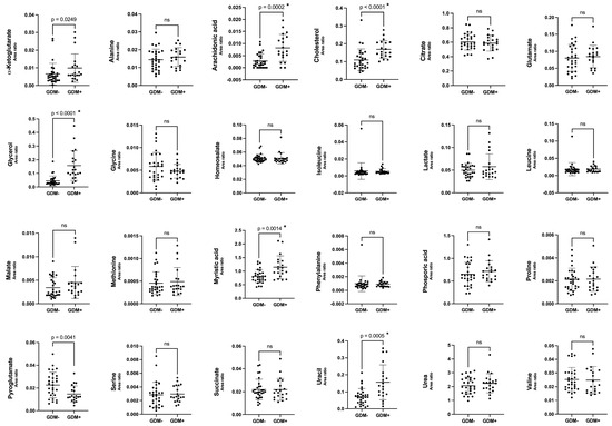 Then, each metabolite was compared between the GDM+ and GDM- groups. In total, out of the 24 metabolites detected and quantified, 6 were found to be significantly different between GDM+ and GDM- human milk (Figure 2). Specifically, there were higher levels of glycerol, uracil, myristic acid, arachidonic acid, and cholesterol in GDM+ human milk. On the other hand, lower levels of pyroglutamate were observed in GDM+ human milk. However, this result was no longer significant after adjustment for multiple comparisons. These results suggest that GDM may also have long-term implications for the mammary gland and human milk composition.