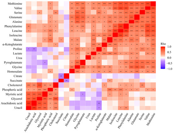 Profile of correlations between human milk metabolites. Heatmap of Spearman correlation between the 24 metabolites studied in all human milk samples from GDM+ and GDM- women. Metabolites are arranged by cluster (based on their correlation similarity). * p value < 0.05, ** p value < 0.005, and *** p value < 0.001.