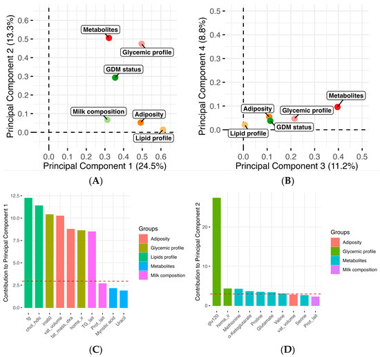 Maternal metabolic profile and human milk composition are associated with GDM status. Visualization of the multiple factor analysis (MFA) modelling human milk metabolite with variables of adiposity (fat mass, visceral adipose tissue), glycemic (insulin, glycemia, HOMA-IR) and lipid (triglycerides, chol/HDLc ratio) profiles, milk composition (protein, lactose, triglycerides), and GDM status. Graphs showing the factors contributing to principal components 1 and 2 (A), and to principal components 3 and 4 (B), of the MFA model are presented. Graphs highlighting the variables that contribute the most to principal component 1 (C) and to principal component 2 (D) are also displayed. The red line represents the expected average contribution of each variable to the component, assuming equal contribution. Variables above the red line contribute more than average to the component.