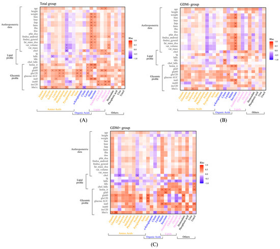 The maternal metabolic profile is associated with human milk metabolites differently in the GDM- and GDM+ groups. Heatmap of Spearman correlation between human milk metabolites and maternal data in total group (A), in GDM- group (B), and in GDM+ group (C). * p value < 0.05, ** p value < 0.005, and *** p value < 0.001. BMI: body mass index; BMR: basal metabolic rate; FATP: fat percentage; FATM: fat mass; FFM: fat free mass; TBW: total body water; Pfat_dxa: fat mass percentage; Fmdxa_android: percentage of fat mass in the android region; Fmdxa_gynoid: percentage of fat mass in the gynoid region; Fat_mass_dxa: fat mass with dexa method; Vat_volume: visceral adipose tissue volume; Vat_mass: visceral adipose tissue mass; Hdlc: high-density lipoprotein cholesterol; Hba1c: glycated hemoglobin; Glucose AUC: glucose area under the curve; Ldlc: low-density lipoproteins cholesterol; Chol/hdlc: cholesterol to Hdlc ratio.