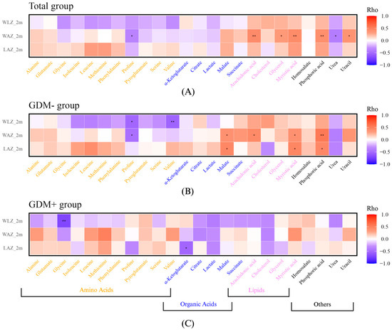 Human milk metabolites are associated with infant growth differently in the GDM- and GDM+ groups. Heatmaps of Spearman correlations between human milk metabolites and infant growth in total group (A), GDM- group (B), and GDM+ group (C). * p value < 0.05 and ** p value < 0.005. LAZ: length-for-age z-score; WAZ: weight-for-age z-score; WLZ: weight-for-length z-score; 2m: at 2 months old.
