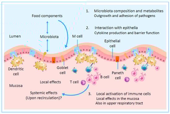 Food can affect the immune system via several different routes [50]. As shown in Figure 1, food can influence the intestinal microbiota composition as well as the metabolites they produce. A second effect food components can have acts via the intestinal epithelium, which can produce cytokines and chemokines and attract immune cells to the tissue. The barrier function of intestinal epithelium is also very important to prevent leakage and transcytosis of bacteria(l components), viruses, and food allergens into the underlying tissue. Further, food can directly interact with the cells of the immune system in the intestinal tissues via sampling of the intestinal content by dendritic cells and M cells that can then initiate immune responses. These effects are mainly local, although systemic effects have also been observed. Finally, food components that become systemically available via uptake in the bloodstream can support immune function at distant sites throughout the body (typically, small components like micronutrients). In addition, food components can potentially also come into direct contact with the immune system that links to the respiratory tract via the tonsils [51].