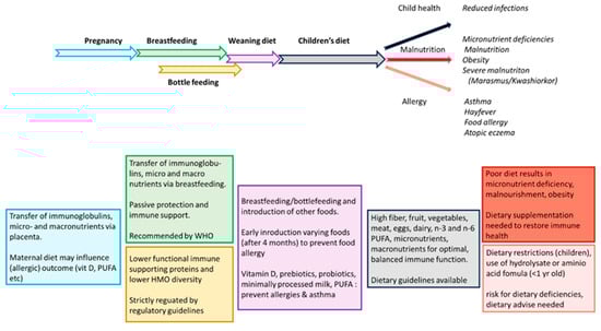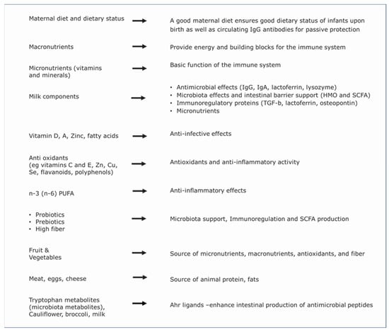 Nutrition affects not only the function but also the development of the immune system and the risk of developing infectious diseases, especially in the first days and months of life. The role of maternal nutrition in this is becoming clearer, as one’s maternal nutritional status will not only influence the composition and quality of breastmilk [61] but also the nutritional status of the infant just after birth [62], as well as the infant’s microbiota composition [63,64]. Breastmilk composition has clear effects on the infant’s immune system, as reviewed elsewhere by [65,66].