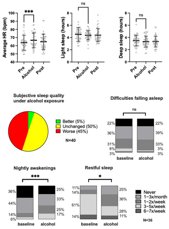Selected sleep and HR parameters. Depicted are objective results for average HR and light and deep sleep before (pre), during (alcohol), and after (post) exposure to alcohol. Subjective data on sleep quality were assessed as indicated at baseline and after alcohol exposure. Upper panels show mean and SD. Lower panels indicate relative proportions. HR—heart rate; bpm—beats per minute; ns—not significant; ***—p < 0.001; *—p < 0.05.