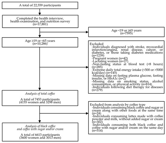 - Choi, S.; Je, Y. Association between coffee consumption and metabolic syndrome in Korean adults. Eur. J. Clin. Nutr. 2024, 78, 905–915. [Google Scholar] [CrossRef] [PubMed]