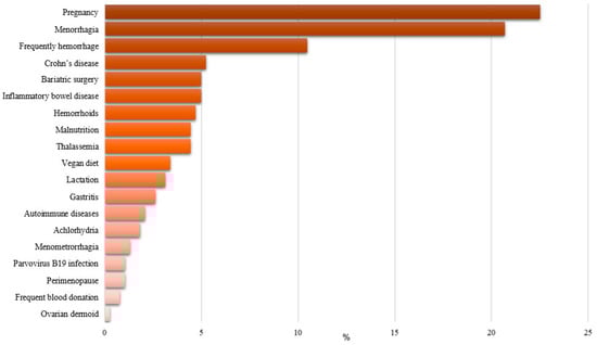 Genetic conditions (thalassemia), lifestyle factors (frequent blood donation), and physiological states (lactation, perimenopause) have also been reported but with lower frequency.