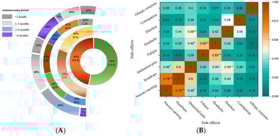 (A) Prevalence of side effects of anemia treatment and (B) correlation between multiple side effects simultaneously. The data were analyzed using Pearson’s correlation coefficient (r), and the interpretation symbols are as follows: ** p < 0.01, * p < 0.05. P.S.E.—presence of side effects; A.S.E.—absence of side effects; O.A.—oral administration; I.V.—intravenous administration; L.D.—low dose; M.D.—moderate dose; H.D.—high dose. The iron administration was categorized into three dosage levels: (i) low dose (≤100 mg/day (oral) or ≤200 mg/infusion (IV)); (ii) moderate dose (101–200 mg/day (oral) or 201–500 mg/infusion (IV)); and (iii) high dose (>200 mg/day (oral) or >500 mg/infusion (IV)).
