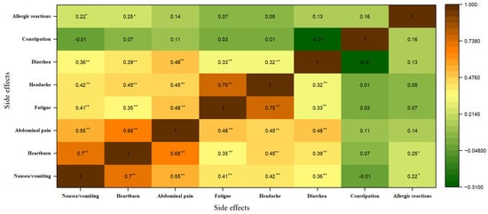 Severity heatmap correlation of the symptoms of adverse effects. The data were analyzed using Pearson’s correlation coefficient (r), and the interpretation symbols are as follows: ** p < 0.01, * p < 0.05.