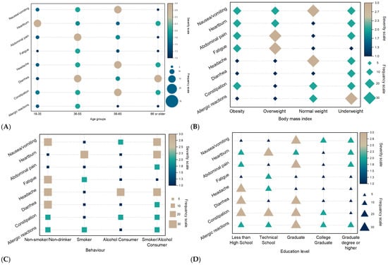 Associations between severity, frequency of side effects, and age period (A), body mass index (B), behavior (C), and education level (D). All data are presented as the mean of severity for each side effect.