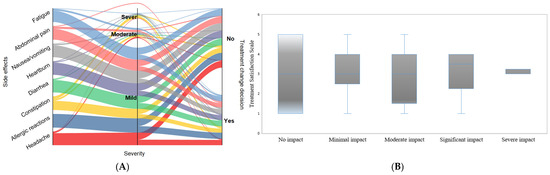 Impact of side effect severity on clinical decision-making and treatment modifications (A) and treatment satisfaction in relation to quality of life (B). The Sankey diagram (A) visualizes the relationship between different side effects, their severity (mild, moderate, severe), and whether treatment modifications were made (Yes or No). The width of each flow represents the proportion of patients experiencing a particular side effect at each severity level and the corresponding treatment decision. The boxplots (B) present the variation of the investigated parameters where the midline represents the median values. At the same time, the extreme lines indicate the value of the first and third quartiles.