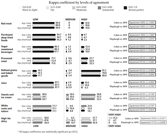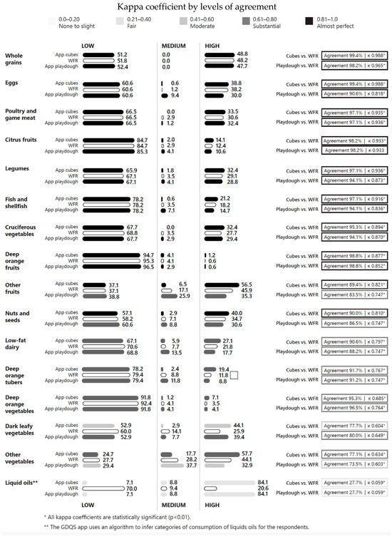 The Kappa coefficient of agreement was used to quantify the level of agreement between WFR and cubes or playdough for GDQS categorical data. Outcomes assessed included percent at low, moderate, and high risk of poor diet quality outcomes, and percent at low, medium, and high (and very high, in the case of high-fat dairy) levels of consumption for the 16 GDQS positive food groups and the 9 GDQS negative food groups.