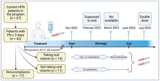 Timeline of Shortage and Patient Flow Diagram (IV multivitamins were given during the shortage based on the patient’s HPN reliance. Patients that previously received IV multivitamin in their PN 6–7 days a week were given 10 mL of IV multivitamin for five days a week. Patients receiving HPN 5 days a week were given IV multivitamin 3 days a week). Created in BioRender. Unhapipatpong, C. (2025) https://BioRender.com/r97u682 (accessed on 20 February 2025).