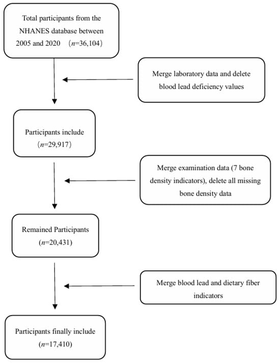We analyzed NHANES data from participants aged ≥ 30 years (n = 36,104) collected between 2005 and 2020. After excluding individuals lacking blood lead measurements (n = 6187) and BMD records (n = 9486), 17,410 eligible participants with complete dietary fiber data were included in this cross-sectional study. Figure 1 presents a flowchart of the participant selection process. Blood lead levels were quantified at mobile examination centers using inductively coupled plasma mass spectrometry (ICP-MS) following standardized NHANES protocols. Dietary fiber intake was determined through 24 h recall surveys, with dual measurements averaged for analysis; single measurements were retained when available. Participants were stratified into low-/high-exposure groups using median splits for both blood lead and dietary fiber intake. All laboratory procedures adhered to CDC Environmental Health Laboratory quality assurance standards. Dual-energy X-ray absorptiometry (DXA) was used to measure the femoral, lumbar, and femoral neck BMD. Following the WHO criteria, osteoporosis was defined as a T-score ≤ −2.5. T-scores were calculated as follows: T-score = (Individual BMD-Reference population mean BMD)/Reference population SD. Detailed calculation methods are described elsewhere [28].