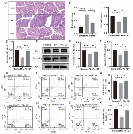 DF restored intestinal structure and Treg cells disrupted by Pb exposure. (A) Hematoxylin and eosin-stained sections (n = 6–10) at a 200 µm scale, with insets showing 100 µm-magnified regions. Annotations: inflammatory infiltrates (red arrows), goblet cells (blue arrows), intestinal crypts (yellow arrows). (B) Studies on intestinal morphology involved the assessment of cumulative scores encompassing inflammatory infiltration, crypt damage, and goblet cell impairment. (C,D) The mRNA expression of the ZO-1 and Occludin gene in colon tissue (n = 6–10). (E–G) The protein expression of the ZO-1 and Occludin gene in colon tissue (n = 3). (H–J) Representative flow cytometry image of Treg cell subpopulations in the colon. (K) Percentage of Treg cell subsets in CD4 + T cells in mice colon (n = 6–10). (L–N) Representative flow cytometry images of Treg cell subpopulations in the bone. (O) Percentage of Treg cell subsets in CD4 + T cells in mice bone (n = 6–10). Data are presented as mean ± SD. * p < 0.05, ** p< 0.01, *** p < 0.001, and **** p < 0.0001 (Dunnett multiple-comparison test).