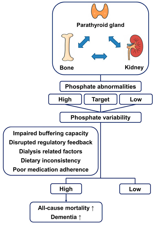 Conceptual diagram illustrating the regulatory interplay between the parathyroid gland, bone, and kidney in phosphate regulation and the implications of phosphate variability.