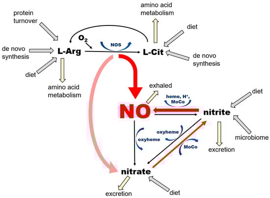 NO is a product of enzymatic conversion of L-arginine (L-Arg) to L-citrulline (L-Cit) by three nitric oxide synthase (NOS) enzymes. This reaction requires the presence of oxygen and several co-factors for NOS, some of which (such as tetrahydrobiopherine, BH4) are highly susceptible to oxidation. There are two possible outcomes of this reaction—NO and nitrate—depending on kinetics of NO release from heme, which differs among the NOS isoforms. According to [30], eNOS produces mostly NO (“productive cycle”), and more than 60% of NO synthetized by nNOS is released from heme as nitrate (the “futile cycle”). The nitrate cycle operates without the presence of oxygen and relies on the nonenzymatic reduction of nitrate to nitrite by nitrate reductases—proteins containing molybdopterin motive (MoCo-proteins) that are either of mammalian origin, including xanthine oxidoreductase (XOR), aldehyde oxidase (AO), sulfite oxidase (SO), mitochondrial amidoxime reducing component 1 (mARC) or of bacterial origin (in the saliva, gut, and skin microbiome). The next step, leading to the formation of NO by the reduction of nitrite, is also nonenzymatic and is accomplished by MoCo-proteins, ferrous 5-coordinated heme-proteins (deoxyHb, deoxyMb, cytochromes) or acidic disproportionation at low pH (gastric juices, ischemic acidosis and alike). Unused NO and nitrite can be oxidized back to nitrate by the oxyheme of several usually abundant proteins (oxyHb, oxyMb). The oxidation of NO to nitrite in plasma by ceruloplasmin had been also proposed [31].