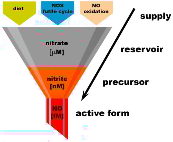 The amounts of active “free NO” necessary for normal physiological processes are estimated to be in the high fM range and are usually not measured directly due to the short half-life of NO in a biological millieu. Free NO in the presence of oxygen is quickly oxidized to nitrate by many heme proteins. Nitrite concentrations in tissues were measured in the low–mid-nM, with nitrite being significantly less reactive than NO itself but still susceptible to oxidation to nitrate by heme proteins. Almost all circulating nitrite originates from the reduction of nitrate; only small amounts are ingested from diet. At baseline conditions, nitrate concentrations reach the mid-mM range. The main nitrate sources are diet, the NOS futile cycle, and the oxidation of NO. Increasing dietary nitrate intake leads to significant increase in nitrate levels detected in the body, to the high-mM range. This “gradient” of nitrate–nitrite–NO concentrations can be represented as a “funnel” supplying nitrate from its sources to the reservoirs in tissues and to its final active product, NO, through its immediate precursor form, nitrite.