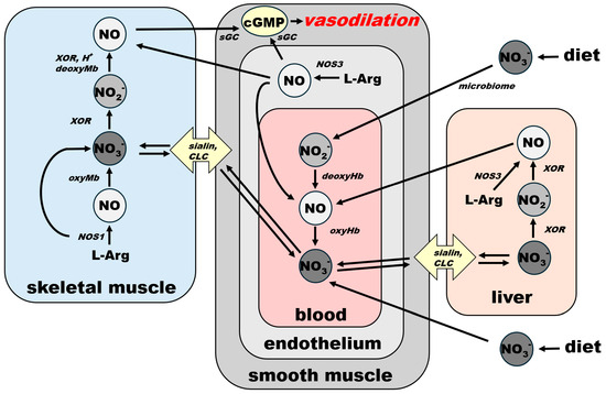 Nitrate itself is also absorbed from the stomach and passed into the bloodstream, but the majority of it, up to ~75%, is excreted to urine by kidneys [35]. A portion of nitrate that is not processed to nitrite or excreted enters cells via sialin [36,37,38,39] or CLC transporters [38,40], with both transporters ubiquitously distributed on cell surface of many organs. With the exception of its reduction to nitrite, human cells are unable metabolize nitrate [18], which predisposes this ion to be an excellent inert NO storage molecule, with the largest accumulation found in skeletal muscle, skin, and the skeleton [29]. The nitrate–nitrite–NO reductive pathway does not require oxygen, and, in fact, oxygen acts as its inhibitor, due to its inhibitory effects on bacterial and mammalian nitrate and nitrite reductases. This pathway is activated by a low pH, which allows the body to increase NO supply quickly and contributes to exercise-induced functional hyperemia in skeletal muscle [41] and heat-induced hyperemia in skin [42], both due in part to the lowering of pH.