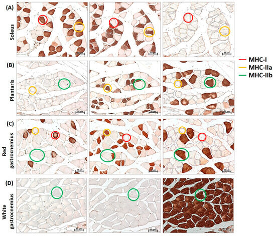 Identification of MHC-I (myosin heavy chain), IIa, and IIb in cross-sections of mouse muscles. Representative example of immunohistochemistry for MHC-I (red circle), MHC-IIa (yellow circle), and MHC-IIb (green circle) in serial cross-sections of the soleus (A), plantaris (B), red gastrocnemius (C), and white gastrocnemius (D) muscles of mice. Neither type IIx nor hybrid fibers were evaluated in this study. Images were captured at a magnification of 200×. Bar 50 μm.