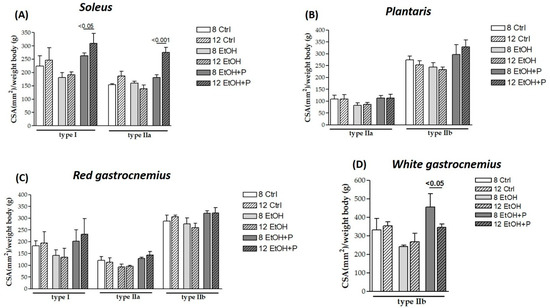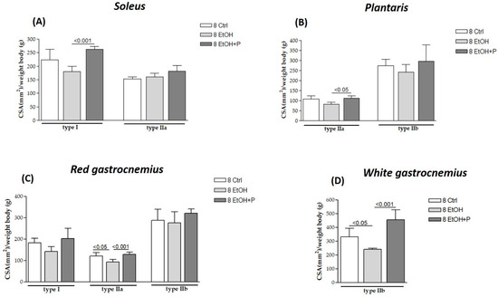 Cross-sectional area (CSA) of type I, IIa, and IIb muscle fibers in the soleus (A), plantaris (B), red gastrocnemius (C), and white gastrocnemius (D) muscles in mice treated for 8 weeks with water (8 Ctrl), ethanol (8 EtOH), and ethanol + probiotic (8 EtOH + P), respectively. Analyses were performed using three fields per section (40 μm between sections) and five mice per group. An average of 352 fibers were analyzed for each mouse. The mean of the CSA values obtained was normalized to the body weight of the corresponding mouse [27]. Data are presented as the mean ± SD.