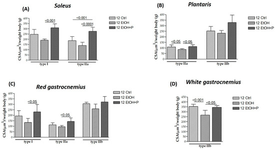 Cross-sectional area (CSA) of type I, IIa, and IIb muscle fibers in the soleus (A), plantaris (B), red gastrocnemius (C), and white gastrocnemius (D) muscles in mice treated for 12 weeks with water (12 Ctrl), ethanol (12 EtOH), and ethanol + probiotic (12 EtOH + P), respectively. Analyses were performed using three fields per section (40 μm between sections) and five mice per group. An average of 352 fibers was analyzed for each mouse. The mean of the CSA values obtained was normalized to the body weight of the corresponding mouse [27]. Data are presented as the mean ± SD.
