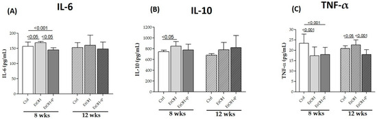 To determine the possible anti-inflammatory effects of L. fermentum administration at the local level, IL-6, IL-10, and TNF-α levels were measured via ELISA, directly in skeletal muscle homogenates, in the two treatment periods (8 and 12 weeks). As shown in Figure 5, EtOH administration for 8 weeks increased IL-6 (p < 0.05) (Figure 5A) and IL-10 (p < 0.05) (Figure 5B) levels compared to the Ctrl group and reduced TNF-α levels (p < 0.001) (Figure 5C) compared to the Ctrl group. On the contrary, co-treatment with L. fermentum for 8 weeks reduced both IL-6 levels not only compared to the EtOH-only group (p < 0.05) but also compared to the Ctrl group (p < 0.001) (Figure 5A) and TNF-α levels compared to the Ctrl group (p < 0.001) (Figure 5C). After 12 weeks of treatment, only a change in TNF-α levels was observed, in particular, an increase in this cytokine in the EtOH-treated mice compared to the Ctrl group (p < 0.05) and a reduction in TNF-α levels in the animals co-treated with EtOH + P compared to the EtOH-only group (p < 0.001) (Figure 5C).