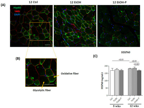 (A) Representative immunofluorescence images of Hsp60 tissue distribution in skeletal muscle of mice fed a standard diet (12 Ctrl), ethanol (12 EtOH), and ethanol plus L. fermentum LF31 (12 EtOH + P) for 12 weeks. Scale, 25 µm bar. (B) Enhanced magnification of the images shown in (A). (C) ELISA assays of Hsp60 on whole murine model hindlimb muscle lysates after 8 and 12 weeks of treatment. The analysis was conducted on six mice in each group. Data are presented as the mean ± SD.