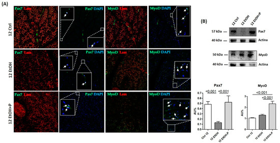 (A) Representative immunofluorescence images showing Pax7 and MyoD expression in skeletal muscle sections from mice fed a standard diet (12 Ctrl), ethanol (12 EtOH), and ethanol combined with L. fermentum LF31 (12 EtOH + P) for 12 weeks. Arrows indicate colocalization of MyoD and Pax7 with DAPI, indicating nuclear localization of MyoD and Pax7 factors in satellite cells (SCs). Scale, 25 µm bar. (B) Representative Western blots of Pax7 (57 kDa) and MyoD (50 kDa) in skeletal muscle tissues from mice (n = 3) fed a standard diet (12 Ctrl), ethanol (12 EtOH), and ethanol plus L. fermentum LF31 (12 EtOH + P) for 12 weeks; 40 µg of protein was loaded in each lane; actin (40 kDa) was used as the loading control. Data are presented as the mean ± SD.