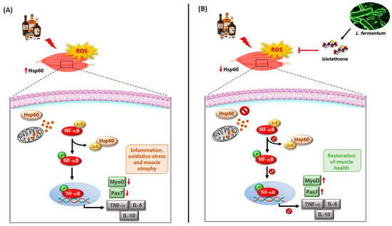 Working hypothesis. (A) Chronic alcohol consumption leads to an increase in circulating reactive oxygen species (ROS) and, locally, to an increase in the mitochondrial protein Hsp60. Hsp60, in the presence of oxidative stress, could translocate from the mitochondria to the cytoplasm via a voltage-dependent anion channel located on the mitochondrial membrane and interact directly with IκB. The dissociation of IκB from NF-κB would induce the phosphorylation of NF-κB (pNF-κB) and its translocation to the nuclear level, where it could induce the expression of inflammatory cytokines, including TNF-α, IL-6, and IL-10, as well as the reduction of the expression of markers responsible for mechanisms of muscle regeneration and differentiation, such as Pax7 and MyoD. These events would be responsible for the atrophy of muscle fibers found in animals treated with alcohol for 8 and 12 weeks. (B) The potential effects of L. fermentum may involve modulation of the NF-κB signaling pathway [24]. The probiotic L. fermentum, through the production of the antioxidant glutathione, could induce the reduction of local Hsp60 levels as a protective mechanism against oxidative stress. In this way, Hsp60 would not be exported from the mitochondria to the cytoplasm and would not interact with IκB. NF-κB would therefore remain associated with IκB in an inactive complex and could not activate the expression of inflammatory cytokines. Consequently, the negative effects of alcohol-induced damage, such as the reduction of markers of muscle regeneration and differentiation (Pax7 and MyoD) at the muscle level, may be enhanced. These phenomena would contribute to counteract the atrophy of skeletal muscle fibers induced by chronic EtOH consumption, suggesting a possible protective role of the probiotic L. fermentum.