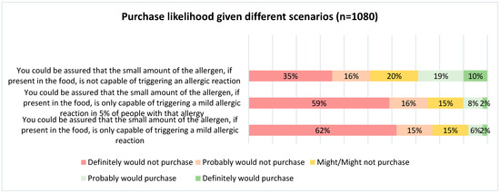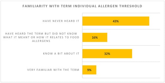 As proposed by the FAO/WHO WG in 2022 [16], the use by manufacturers of reference doses combined with allergen risk assessments for the management of PAL could be an option which would allow a possible reduction in the use of PALs on pre-packaged food products and would contribute to reducing the reported variability of allergen concentrations in products with PAL. However, while this approach would standardize and significantly improve the approach manufacturers take to the application of PAL, our study shows it is challenging for the allergic consumer. With limited understanding of the concept of thresholds, including familiarity with their own threshold of reactivity, they are not willing to buy foods that contain even a small amount of allergen in the product, which might only cause mild reactions in a small minority of allergic individuals. Allergic consumers are not comfortable with the concept of reference doses but when they learn the current uncertainties and lack of regulation regarding the use of PAL, they become concerned with the status quo. With almost half of the respondents believing zero risk is possible, there is a lack of understanding of the manufacturing process and the approach some companies take to mitigate risks. This makes it even more difficult to then have consumers contemplate how set reference doses would create a better system to determining PAL. Furthermore, if these international recommendations were to be regulated in Canada, transparency and consumer education on this approach is required to explain the rare possibility of food allergic reactions in the context of an unlabelled unintended presence of allergen in a food product. In addition, for the 5% with a reactivity threshold below the ED05, the FAO/WHO recommendations may not improve their QoL because the absence of PAL could mean either an absence of the allergen or an amount of allergen sufficient to trigger an allergic reaction in these very sensitive individuals. For these patients, options will have to be proposed before moving forward with the FAO/WHO recommendations.