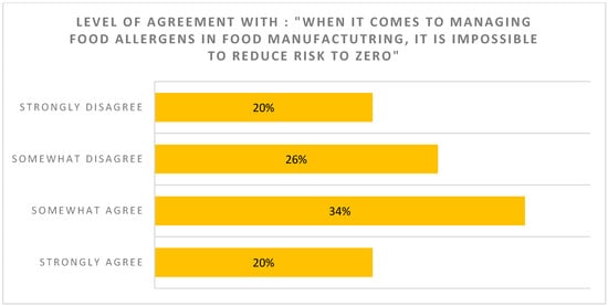 Allergen thresholds: Consumers were reluctant to buy foods with even a small amount of their allergen in the product, even if they could be assured that the small amount of allergen is highly unlikely to trigger an allergic reaction in the vast majority (Figure 1). In total, 59% of surveyed individuals had not heard the term “individual allergen threshold” or had heard the term but did not know what it meant (Figure 2). For 54% of respondents, their perception was that it is impossible to reduce the risk to zero when it comes to managing food allergens in food manufacturing (Figure 3). The majority of respondents (83%) did, however, agree that a standardized, scientific, risk-based approach to PAL is needed, and this would make PAL less confusing (70%), more useful (78%) and increase confidence among those managing food allergies (76%) when purchasing food products