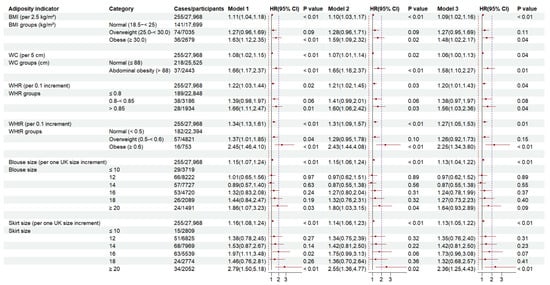 Baseline characteristics of the 27,968 participants by indicators of obesity-related health are presented in Supplementary Tables S5 and S6. Different adiposity indicators showed consistent associations with demographic and lifestyle factors. Specifically, participants with higher BMI, WC, WHR, WHtR, and larger blouse or skirt size were more likely to be older, postmenopausal, have lower education levels, be unmarried, and hold non-professional occupations. Also, chronic diseases and HRT use were more prevalent among participants with higher adiposity, with the highest occurrence observed in those with a WHtR ≥ 0.6 (n = 115 [15.6%]). Physical activity levels were highest in participants with a skirt size ≤ 10 (17.7 h/week, SD 12.0), a blouse size ≤ 10 (17.1 h/week, SD 11.5), and those in the normal weight group (16.8 h/week, SD 11.4), and lowest among individuals living with obesity (BMI ≥ 30 kg/m2, 15.8 h/week, SD 12.9), a WHtR ≥ 0.6 (15.8 h/week, SD 12.6), and a skirt size ≥ 20 (15.4 h/week, SD 12.0). Participants with higher BMI, WC, WHR, WHtR, blouse size, and skirt size were generally less likely to smoke, consume alcohol, or have a high diet quality. Energy intake was highest in the group with a WHR of 0.80–0.85 (2355 kcal/day, SD 697.8) and lowest among those with a skirt size ≤ 10 (2287 kcal/day, SD 714.8).