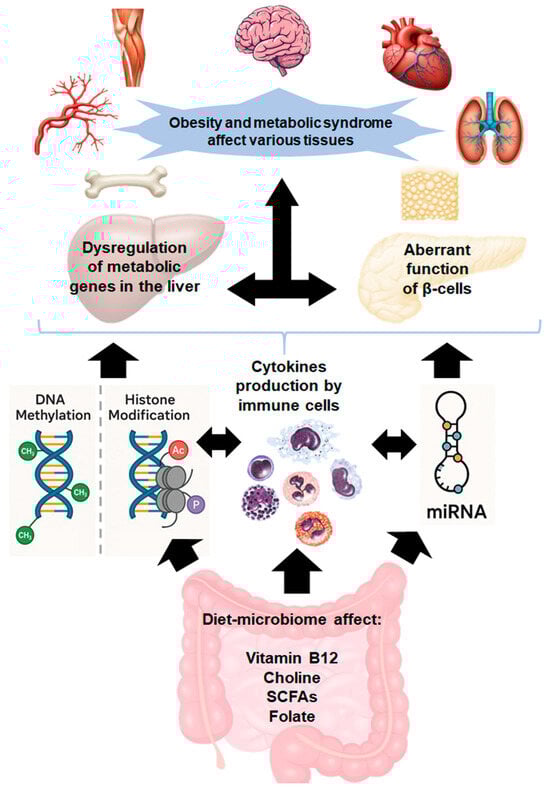 The gut microbiota metabolizes dietary components, producing bioactive compounds such as folic acid, vitamin B12, and short-chain fatty acids (SCFAs), which influence the epigenome and gene expression. Gut dysbiosis not only disrupts the synthesis of these bioactive compounds but also triggers inflammation, compromising intestinal barrier integrity. This allows harmful metabolites to translocate into the bloodstream, activating immune cells and initiating a cytokine surge. The resulting inflammatory response disrupts metabolic gene regulation in the liver, pancreas, and other tissues, contributing to obesity and metabolic syndrome.