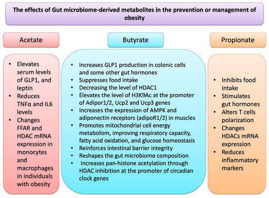 GM-derived metabolites such as butyrate and acetate not only act as inhibitors of HDAC activity but also play key roles in reducing OB-induced inflammation and maintaining gut barrier integrity via regulating the expression of tight junction proteins. These metabolites are also involved in promoting fat thermogenesis, improving mitochondrial function, reducing endoplasmic reticulum stress, hampering autophagy dysfunction, and elevation of the anti-inflammatory M2 macrophages [121,122,123,124].