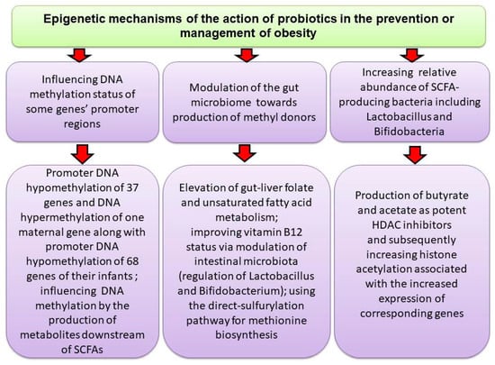 Probiotics are live microorganisms that possess health benefits at proper concentrations by improving gut barrier integrity to prevent the penetration of bacterial antigens and toxic metabolites to blood circulation [160]. Probiotics also contribute to remodeling of the GM and restoring normal performance in subject with OB and gut dysbiosis by introducing beneficial microbes, reducing fecal abundance of pathogenic bacteria, and attenuating the adipose tissue inflammation through restoring the adipose invariant natural killer T cells [161,162,163,164]. Beneficial impact of probiotics against OB and OB-related disorders is through mitigating epigenetic aberrations. For example, probiotic supplementation during pregnancy can reduce the risk of OB in mothers and their infants by influencing DNAmet status of some genes’ promoter regions relevant to OB and weight gain [165]. In this context, Vähämiko et al. found that probiotic supplementation during pregnancy reduced DNAmet levels of 37 gene promoters and increased DNAmet level of one gene promoter in mothers while decreased DNAmet levels of 68 gene promoters in their infants [165]. Moreover, probiotics have demonstrated the ability to reduce body weight and fat accumulation not only through modulation of the GM but also increasing the concentrations of methyl donors such as folic acid. For instance, the administration of Bacteroides thetaiotaomicron to HFD mice for 12 weeks suppressed hyperlipidemia and insulin resistance and decreased body weight and fat accumulation by reducing Firmicutes/Bacteroidetes ratio and elevating gut–liver folate and unsaturated fatty acid metabolism [166].