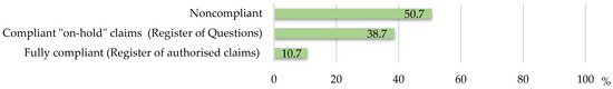 Of the 87 evaluated herbal food supplements, 12 (13.8%) had no health claims on their labels (Table S2). The full spectrum of health claims provided on the labels of the remaining 75 products is presented in Tables S3–S7, while Table 2 presents representative examples. The distribution of the products bearing health claims according to their regulatory compliance is shown in Figure 1.