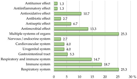 The largest number of the products (more than half) carried health claims related to effects on the respiratory and/or immune systems, namely 19 products (25.3%) on the respiratory, 14 (18.7%) on the immune, and 11 (14.7%) on both the respiratory and immune systems. A smaller number of products carried claims about the effects on the gastrointestinal tract (4) and the urogenital (3), the cardiovascular (3), and the nervous systems (2). The effect on several systems of organs was claimed by as many as a quarter of the products (19 out of 75) bearing claims. The distribution of the products according to the claimed effect on a particular system of organs or specific activity is shown in Figure 2.